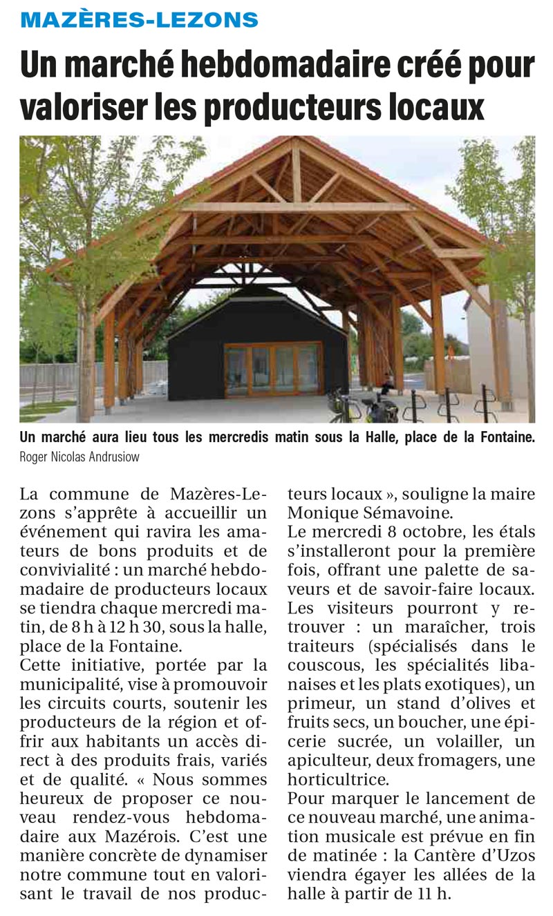 La commune de Mazères-Lezons s’apprête à accueillir un événement qui ravira les amateurs de bons produits et de convivialité : un marché hebdomadaire de producteurs locaux se tiendra chaque mercredi matin, de 8 h à 12 h 30, sous la halle, place de la Fontaine.